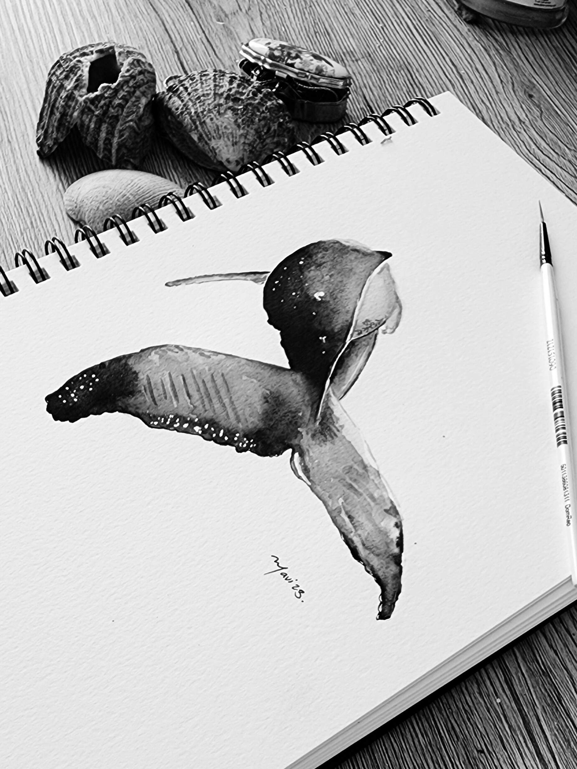 Painting whales and nature with watercolors is a process filled with inspiration and purpose. It starts with observing the natural world whether it’s the graceful movement of whales or the beauty of plants and landscapes. I draw ideas from real-life experiences, photos, and conversations with people who love nature as much as I do.Using watercolor paper, brushes, and vibrant paints, I create art that reflects the connection between life and water. I start with light washes to form the base, then layer colors to add depth and texture. For whales, I focus on their flowing movements and the ocean’s colors, using soft strokes and natural tones to bring them to life on the page.This creative process isn’t just about making art it’s about connecting with people who share my passion for nature and whales. Each piece I create is a way to show the beauty of biodiversity and why it’s worth protecting.Painting nature and whales has changed how I see the world. It’s taught me that art can inspire others, raise awareness, and play an important role in conservation. It reminds me of the powerful connection between creativity and protecting the planet. Through my art, I hope to bring people closer to nature and spark action to care for it.